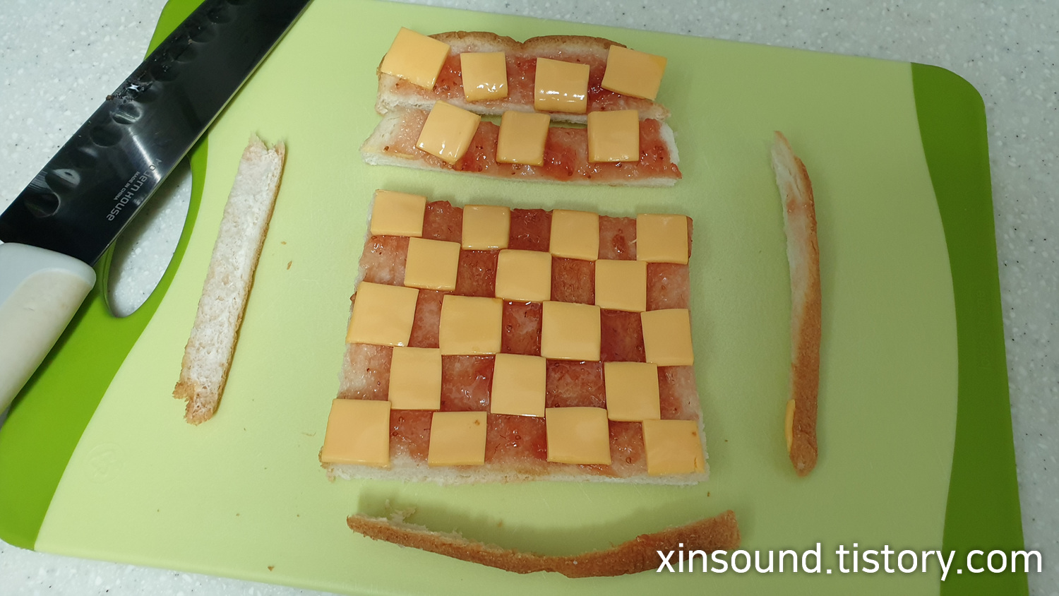 5. 딸기잼 위로 잘라놓은 체다치즈를 조각조각 체크무늬처럼 올려서 모양을 만들어주세요!