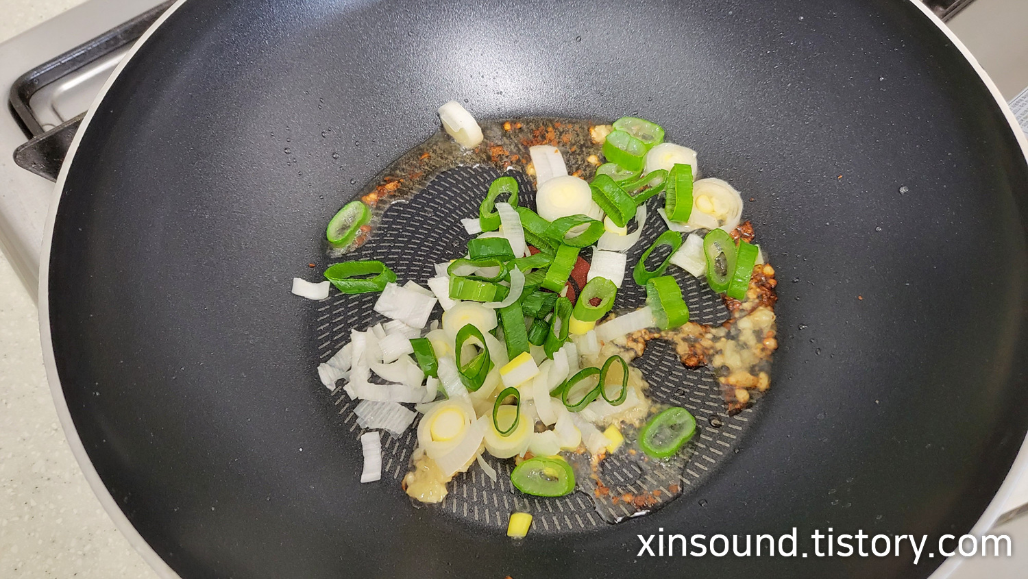 2. 대파가 준비된 다음 냄비 또는 웍을 준비해 식용유 3~4숟가락 정도 두르고 달궈주세요!