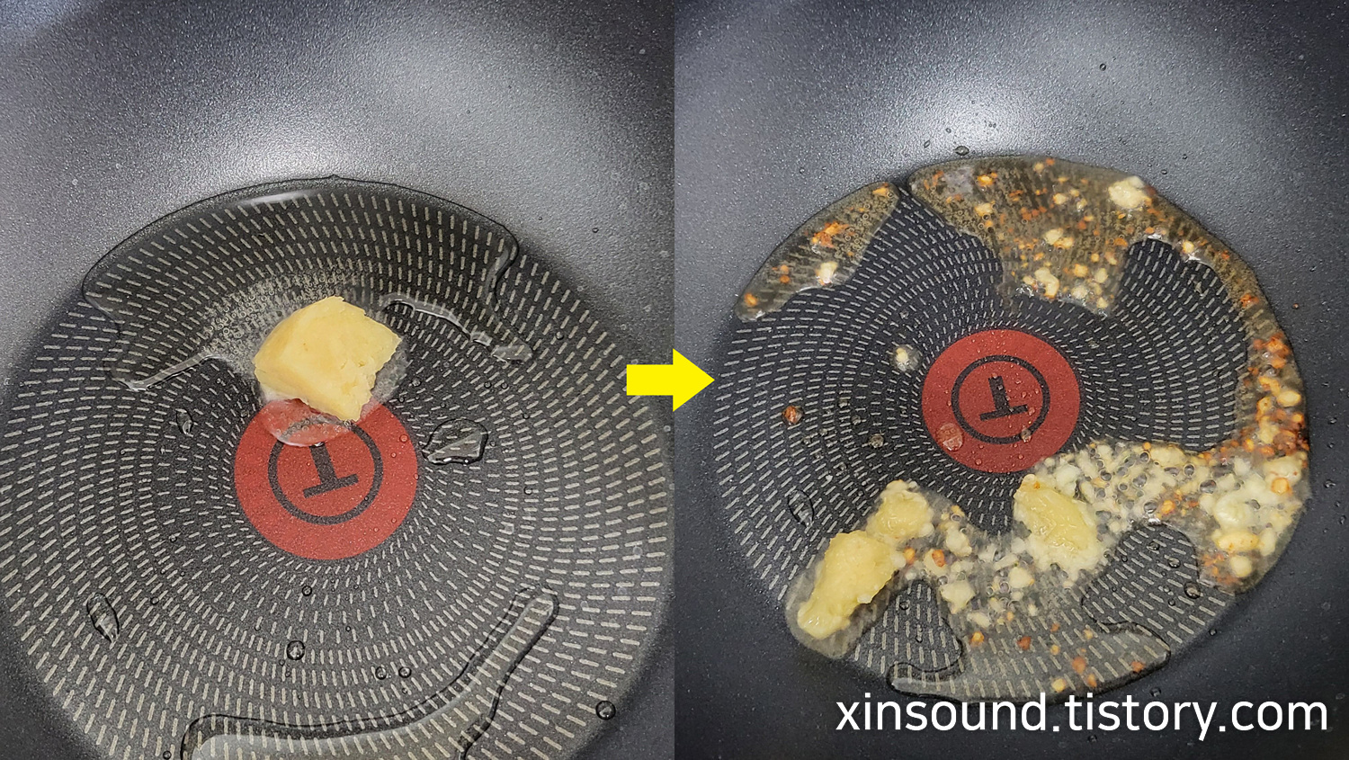 3. 달궈진 식용유 위로 먼저 다진 마늘 1/2숟가락을 넣고 중불로 살짝 볶아주세요!