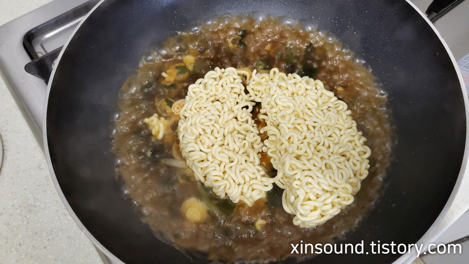 8. 보글보글 끓기 시작하면 라면 면 투하!