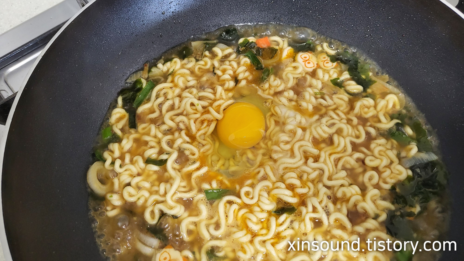 9. 면이 익으면서 풀어진 형태가 되면 계란 추가!