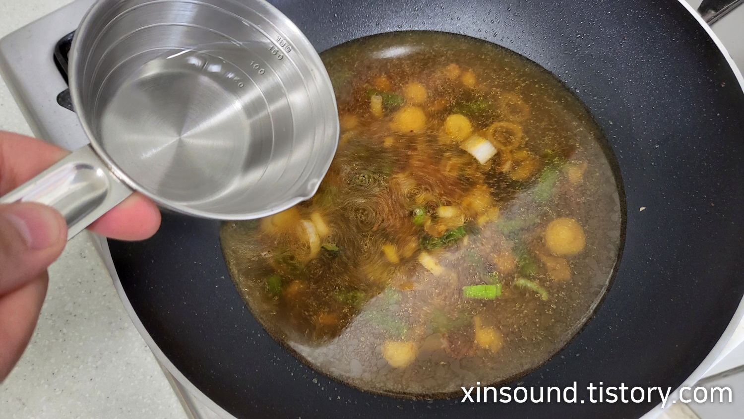 6. 볶아진 상태에서 물(생수) 550ml를 부어서 끓여줍니다!