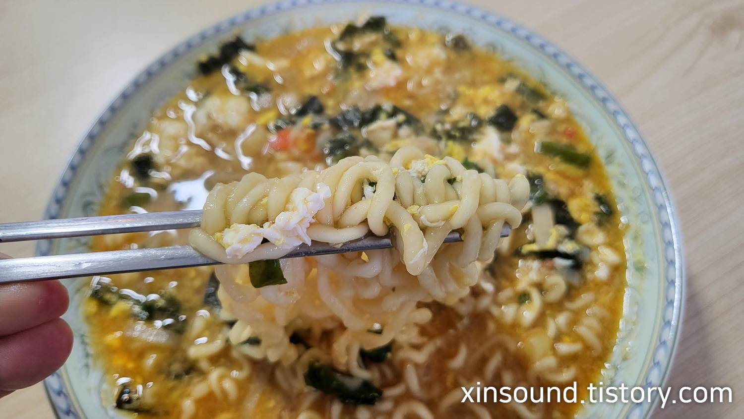 입으로 들어가기 전 너구리 대파라면을 가까이서 촬영해 자세한 모습을 보여드리구요! 너구리 얼굴 모양의 건더기로 해당라면임을 알려주면서 미역과 대파 그리고 계란이 잘 어우리전 먹음직스러운 모습으로 맛이 어떻게 변했을지 더 궁금해져 갔네요!